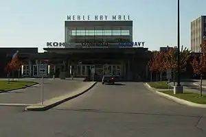 On March 10, 2008, the Des Moines city council agreed to rezone the area around Merle Hay Mall into a tax increment financing district in order to help the mall's owners pay for future renovations. The move came as the mall's assessed property value had declined by over $13 million since 2005.[23] Merle Hay Mall's owners constructed a new main entrance to the mall and relocated some retailers to other areas of the mall in order to create space for new "junior" anchor stores with exterior entrances.[24] The spaces occupied by the former Sam Goody Superstore (replaced by Staples), the former Waldenbooks and GameStop (which is now next to the Helzberg's Diamonds) were renovated to include Staples. Old Navy moved to the west into a space across from their former location which made way for Shoe Carnival and Ulta to occupy Old Navy's space.[22] As a result of the redevelopment, Old Navy has relocated to a smaller space within the mall.[22] In 2013, Dunham's Sports moved out of the mall, with MC Sports replacing it. However, in 2017, MC Sports filed for bankruptcy and moved out shortly after. It has since been replaced with a bouncy-house arena.[25] The upper level became a Flix Brewhouse movie theater in mid-2014. Flix has proven to be an exceptionally popular destination not just in the mall, but in all of greater Des Moines.[26] In 2015, Deb closed. Staples announced in late-2016 that it would be closing their store in Merle Hay Mall with the actual last day of business occurring on February 4, 2017. In October 2017, the Staples location became Ross Dress for Less. On April 18, 2018 it was announced that Younkers would be closing, as the parent, Bon-Ton Stores, was going out of business. The store closed on August 29, 2018.[27] On July 13, 2018 Sears announced they will also be closing at Merle Hay Mall. The nearly 60 year-old anchor was one of the original stores but ended business at the mall in October 2018 which left Kohl's and Target as the only anchors.[28] In December 2019, GameDay arcade and restaurant opened in the mall. It is accessible from both outside and inside the mall.