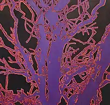 In 2010, Temkin shifted subject matter from fingerprints to trees, still retaining her labor-intensive working process. Recalling both her fence installations and her re-assembled fingerprints, she describes her process as perceiving "negative space on canvas in three dimensions… By carving away this space with paint, the tree is revealed, a process of working from the outside to depict the inside."[33] In these in-depth explorations of color, Temkin allows under-layers to show through, creating depth, vitality and a visual record of its own development. The series, evolving through Temkin's rigorous exploration, has moved in varying degrees toward and away from abstraction, producing often surprising results that range from "striking cactus-like silhouettes, painted in desert-twilight tones"[34] to graphic forms resembling thermographic maps, visual afterimages, and reversed video stills.