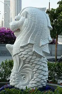 The Merlion (/ˈmɜːrˌlaɪən/) is the national symbol of the city-state of Singapore. It is depicted as a mythical creature with the head of a lion and the body of a fish. Being of prominent symbolic nature to Singapore and Singaporeans in general, it is widely used to represent both the country and its people in sports teams, advertising, branding, tourism and as a national personification and patriotic emblem of the Singaporean nation.[1]