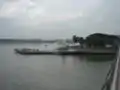 Upon the completion of the Esplanade Bridge in 1997, the original Merlion Park location was also no longer the entrance of Singapore River and the statue could no longer be viewed clearly from the Marina Bay Waterfront.[3] On 23 April 2002, the statue was relocated to a new pier specially built on the other side of The Esplanade Bridge adjacent to The Fullerton hotel. The move, which cost $7.5 million, was completed on 25 April 2002.[5] On 15 September 2002, then-Senior Minister Lee Kuan Yew ceremonially welcome the Merlion again on its new location, the current Merlion Park, which is four times bigger than the original site.[6]
