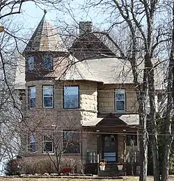 The two-story house was built in 1898 in the Queen Anne style of architecture. The exterior walls are of rusticated stone cut from a local quarry operated by Merritt Black himself. The stone is a bit unusual for Queen Anne, but the varied surface finishes, the bay windows, the 3-story corner tower, the asymmetry, and the complex roof are all typical of the style. If the shape of the house looks a bit abrupt for Queen Anne, it may be because it originally had broad porches wrapping around several sides, which have been removed. Inside are oak doors and stairs and maple floors. In the basement are rooms for vegetable and fruit storage. The house was designed by the Smith brothers of Appleton. The carpenter was Gus Keck, the mason Joseph Schwenderman, and the painter Walter Cuel.[2][3]