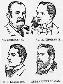Richard and Fothergill were re-elected in 1874. By 1879, however, Fothergill was in financial difficulties and there were calls for him to step aside. A deputation of tradesmen and working men who attended a meeting at Swansea to request to offer himself once again as a candidate but he eventually declined.[7] He was replaced by Charles Herbert James. member of a long-standing politically active family in Merthyr. Both served until 1888 when Richard died and James stood down, leading to two by-elections within a twelve-month period. These led to the return of David Alfred Thomas and William Pritchard Morgan. Thomas and Morgan had much in common. Both were nonconformists, both were wealthy industrialists and both placed Welsh issues high on their list of political priorities. However, they also shared 'a hearty loathing' for each other.[8]
