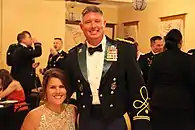 After World War II, the evening dress and mess dress uniforms were reintroduced, with the tail coat having a single Austrian knot (trefoil) over the branch-of-service color (general officers had stars over an oak leaf braid), with the rank placed in the bottom opening of the knot. The mess jacket, intended for black-tie occasions, used an Austrian knot rank system with the branch insignia at the bottom. The number of knots indicated the officer's rank: five for colonel, four for lieutenant colonel, three for major, two for captain, one for first lieutenant, and none for second lieutenant. This complicated system, which required that the braid be altered with a change of rank, was replaced with the evening coat style in 1972, using a single knot and the rank placed above the branch-of-service color. A white mess jacket for summertime wear was introduced in the 1950s. The "special evening dress" (tails) was finally abolished in 1969, although officers already in possession of this uniform could continue to wear it until 1975.[28] It was replaced by the Army blue mess uniform, which in its modern form closely resembles that of 1911. It is common for soldiers to wear suspenders in their branch color with the army dress uniform trousers, although they are concealed under the coat.
