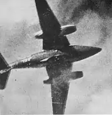 As the Me 262A's pioneering Junkers Jumo 004 axial-flow jet engines needed careful nursing by their pilots, these jet aircraft were particularly vulnerable during takeoff and landing.[70] Lt. Chuck Yeager of the 357th Fighter Group was one of the first American pilots to shoot down an Me 262, which he caught during its landing approach.[71][72] On 7 October 1944, Lt. Urban Drew of the 365th Fighter Group shot down two Me 262s that were taking off, while on the same day Lt. Col. Hubert Zemke, who had transferred to the Mustang equipped 479th Fighter Group, shot down what he thought was a Bf 109, only to have his gun camera film reveal that it may have been an Me 262.[73] On 25 February 1945, Mustangs of the 55th Fighter Group surprised an entire Staffel of Me 262As at takeoff and destroyed six jets.[74]