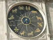 - The upper dial is the planetarium. It shows the orbit of the nine planets of the Solar System around the Sun, at the dial's centre, moving through the signs of the Zodiac. The planets are positioned proportionally to their true distance from the Sun.[10]