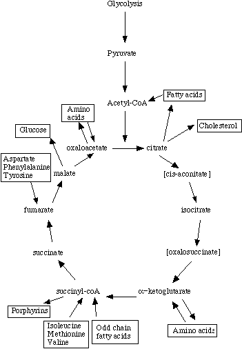 An amphibolic pathway is one that can be either catabolic or anabolic based on the availability of or the need for energy.[9]:570 The currency of energy in a biological cell is adenosine triphosphate (ATP), which stores its energy in the phosphoanhydride bonds. The energy is utilized to conduct biosynthesis, facilitate movement, and regulate active transport inside of the cell.[9]:571 Examples of amphibolic pathways are the citric acid cycle and the glyoxylate cycle. These sets of chemical reactions contain both energy producing and utilizing pathways.[5]:572 To the right is an illustration of the amphibolic properties of the TCA cycle.
