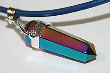 Rainbow quartz is a metal-coated crystal of quartz (SiO2) which is quartz whose surface is synthetically coated in various elements to give it an iridescent metallic sheen. Rainbow quartz has been treated with a combination of titanium and gold. Titanium molecules bond to the quartz using the natural electrostatic charge of the crystal in a process known as magnetron ionization.[3] The brilliant color of flame aura is the result of optical interference effects produced by layers of titanium. Since only electricity is used to deposit the titanium layers and create these colors, very little heat is involved and the integrity of the crystal is maintained.
