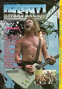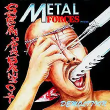 Metal Forces is a British publication founded in 1983 which promotes the music genres heavy metal and hard rock. Metal Forces was well known for its coverage of unsigned bands through its Demolition feature and championed the likes of Metallica,[1] Slayer, Megadeth, HellsBelles, Overkill, Death and Poison long before they had secured record deals. They are credited as contributing in this fashion to the success of the band Anacrusis.[2][3] Dave Reynolds, a former writer for Metal Forces, has claimed that the magazine was the first to coin the terms thrash metal and death metal.[4] A Metal Forces compiled vinyl album, Demolition - Scream Your Brains Out!, based on the magazine's popular Demolition column, was released in 1988 through Chain Reaction Records featuring Anacrusis, Atrophy, Hobbs' Angel of Death, Aftermath and the Chris Barnes fronted Leviathan. In addition to metal acts, the magazine also featured interviews with alternative rock acts such as Nirvana.[5]