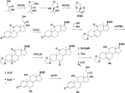 Methylprednisolone, or 6α-methylprednisolone, also known as 11β,17,21-trihydroxy-6α-methylpregna-1,4-diene-3,20-dione, is a synthetic pregnane steroid and a derivative of hydrocortisone (11β,17α,21-trihydroxypregn-4-ene-3,20-dione) and prednisolone (11β,17α,21-trihydroxypregn-1,4-diene-3,20-dione).[39][40] A variety of methylprednisolone esters with differing characteristics exist and have been marketed for medical use.[39][40] They include methylprednisolone aceponate (Advantan), methylprednisolone acetate (Depo-Medrol), methylprednisolone succinate (Solu-Medrol), and methylprednisolone suleptanate (Medrosol, Promedrol).[39][40]