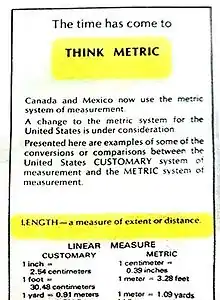 In 1968 Congress authorized the U.S. Metric Study, a three-year study of systems of measurement in the United States, with emphasis on the feasibility of metrication. The United States Department of Commerce conducted the study. A 45-member advisory panel consulted and took testimony from hundreds of consumers, business organizations, labor groups, manufacturers, and state and local officials. The final report of the study concluded that the U.S. would eventually join the rest of the world in the use of the metric system of measurement.[15] The study found that metric units were already implemented in many areas and that their use was increasing. The majority of study participants believed that conversion to the metric system was in the best interests of the United States, particularly in view of the importance of foreign trade and the increasing influence of technology in the United States.