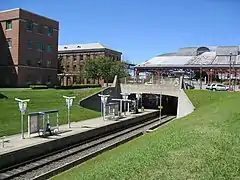 MetroLink is operated by the Bi-State Development Agency, operating as Metro since 2003,[7] in a shared fare system with the MetroBus lines.[8] Despite officially being called "light rail," it features many characteristics of a light metro or rapid transit service,[9][10] including a completely independent right of way, higher top speed, and high level platforms.[10][11]
