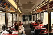 MetroLink operates a fleet of 87 light-rail vehicles composed of 31 SD-400 and 56 SD-460 vehicles. Each 90-foot (27 m), single articulated vehicle has 4 high platform doors per side and has a capacity of 72 seated and 106 standing passengers.[25][26] The cars are powered by an electric motor which gets its electricity from a catenary wire with a 750 volt supply.[27]