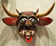 However, the most common fantastic masks are those which depict the devils, demons and Satan himself.[45] These vary from near normal human faces to those with wild and/or grotesque features, with human features, animal features or both.[31][63] Depictions of old pre Hispanic gods remain in masks. Tlaloc was commonly depicted as having serpents around his eyes and with the fangs of a viper. These elements can be found in devil masks today. Tezcatlipoca was a night god, whose colors were black and red. These are also applied to devil masks.[63]
