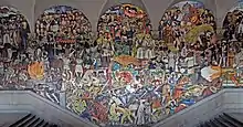 A large quantity of murals were produced in most of the country from the 1920s to 1970, generally with themes related to politics and nationalism focused often on the Mexican Revolution, mestizo identity and Mesoamerican cultural history.[1] Scholar, Teresa Meade also states that “indigenismo; glorification of rural and urban labor and the working man, woman, and child; social criticism to the point of ridicule and mockery; and denunciation of the national, and especially, international ruling classes” were also themes present in the murals at this time.[18] These served as a form of cohesion among members of the movement.[4] The political and nationalistic aspects had little directly to do with the Mexican Revolution, especially in the later decades. The goal was more to glorify it and its results as a means to legitimatize the post Revolution government.[1] The other political orientation was that of Marxism, especially class struggle. This was strongest in the early movement with Rivera, Orozco and Siqueiros all avowed communists. The political messages became less radical but they remained firmly to the left.[1] Much of the mural production glorified the indigenous aspect of Mexican culture, considering it an important factor in the creation of modern Mexico. This was added with the idea of reexamining the country's history from a different perspective. One other aspect that most of the muralists shared was a rejection of the idea that art was only for the elite, but rather as a benefit for the masses.[4] The various reasons for the focus on ancient Mesoamerica may be divided into three basic categories: the desire to glorify the accomplishments of the perceived original cultures of the Mexican nation; the attempt to locate residual pre-Hispanic forms, practices, and beliefs among contemporaneous indigenous peoples; and the study of parallels between the past and present. Within this last context, the torture of Cuauhtémoc was painted by Siqueiros in 1950 in the Palacio Nacional, one of his few depictions of indigenous cultures of any period.[19]