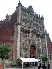 The first church built on the cathedral site also had a tabernacle, but its exact location is unknown. During the construction of the cathedral, the tabernacle was housed in what are now the Chapels of San Isidro and Our Lady of Agony of Granada. However, in the 18th century, it was decided to build a structure that was separate, but still connected, to the main cathedral.[27] It is constructed of tezontle (a reddish porous volcanic rock) and white stone in the shape of a Greek cross with its southern facade faces the Zócalo. It is connected to the main cathedral via the Chapel of San Isidro.[9][3]