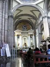 The interiors of each wing have separate uses. In the west wing is the baptistry, in the north is the main altar, the main entrance and a notary area, separated by inside corner walls made of chiluca stone and tezontle. Chiluca, a white stone, covers the walls and floors and the tezontle frames the doors and windows. At the crossing of the structure is an octagonal dome framed by arches that form curved triangles where they meet at the top of the dome.[27] The principal altar is in the ornate Churrigueresque style and crafted by indigenous artist Pedro Patiño Ixtolinque. It was inaugurated in 1829.[9]