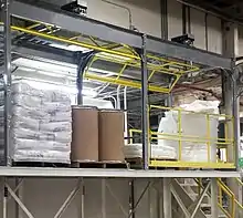 In many industrial operations, openings are cut into the guardrail on mezzanines and elevated work platforms to allow picking of palletized material to be loaded and unloaded, often with a fork truck, to upper levels. The Occupational Safety and Health Administration (OSHA)[11] and International Building Council (IBC)[12] have published regulations for fall protection and The American National Standards Institute (ANSI) has published standards for securing pallet drop areas to protect workers that work on elevated platforms and are exposed to openings.