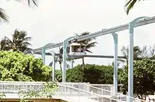 The Miami Seaquarium Spacerail was a monorail at Miami Seaquarium. It was the first hanging monorail in North America. It existed solely for entertainment, not transportation, as it had only one station. It offered views not only of the Seaquarium exhibits and buildings, but also of the Miami skyline. There were six cars, though only five were run at a time, and the cars had names after fish. The cars had unique styling until they were redesigned in 1978 to be rectangular and their names were removed. The cars operated around the loop counterclockwise, and had an Automatic Block Signal system.