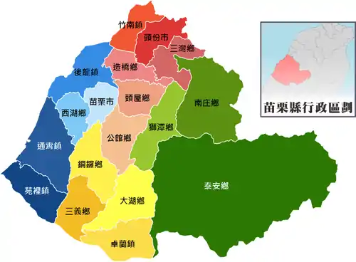 Miaoli County is divided into 2 cities, 5 urban townships, 10 rural townships and 1 mountain indigenous townships.[5][6] Miaoli County has the second highest number of urban townships after Changhua County. Miaoli City is the county seat which houses the Miaoli County Government and Miaoli County Council. The incumbent Magistrate of Miaoli County is Hsu Yao-chang of the Kuomintang.