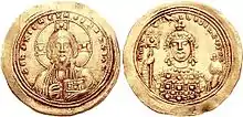 ![]() Histamenon that may have been issued during the reign of Michael V: obverse (left) Christ Pantokrator; reverse (right) the Emperor (crowned by the hand of God) and the Archangel Michael holding a labarum. | |