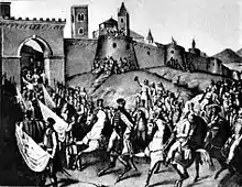 On 28 February 1600 Michael met with Polish envoys in Braşov. He was willing to recognise the Polish King as his sovereign in exchange for the crown of Moldavia and the recognition of his male heirs' hereditary right over the three principalities, Transylvania, Moldavia and Wallachia. This did not significantly delay his attack however; on 14 April 1600 Michael's troops entered Moldavia on multiple routes, the Prince himself leading the main thrust to Trotuş and Roman.[33] He reached the capital of Iaşi on 6 May. The garrison surrendered the citadel the next day and Michael's forces caught up with the fleeing Ieremia Movilă, who was saved from being captured only by the sacrifice of his rear-guard. Movilă took refuge in the castle of Khotyn together with his family, a handful of faithful boyars and the former Transylvanian Prince, Sigismund Báthory.[32] The Moldavian soldiers in the castle deserted, leaving a small Polish contingent as sole defenders. Under the cover of dark, sometime before 11 June, Movilă managed to sneak out of the walls and across the Dniester to hetman Stanisław Żółkiewski's camp.[33]