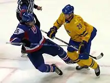 ![]() Handzuš (left) is knocked down by Swedish centre Henrik Sedin during the 2010 Winter Olympics. | ||