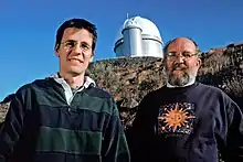 Mayor's work focused more on improving instrumentation for radial velocity measurements to improve detecting exoplanets and measuring their properties. Mayor led a team to further improve ELODIE to increase velocity measurement accuracy to 1 m/s via the High Accuracy Radial Velocity Planet Searcher (HARPS) installed on the ESO 3.6 m Telescope at La Silla Observatory in Chile by 2003.[18] Mayor led the team that used HARPS to seek out other exoplanets. In 2007, Mayor was one of 11 European scientists who discovered Gliese 581c, the first extrasolar planet in a star's habitable zone, from the ESO telescope.[19] In 2009, Mayor and his team discovered the lightest exoplanet ever detected around a main sequence star: Gliese 581e.[20] Nonetheless, Mayor noted that humans will never migrate to such exoplanets since they are "much, much too far away ... [and would take] hundreds of millions of days using the means we have available today".[7] However, due to discoveries by Mayor, searching for extraterrestrial communications from exoplanets may now be a more practical consideration than thought earlier.[8]