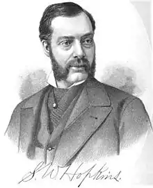 Samuel Whaley Hopkins was born in 1845 in Exeter, Rhode Island, the youngest child of Samuel and Freelove Burlingame Hopkins.[2] At age 11, his family moved to Connecticut, where Hopkins attended school. At age 16, he taught school, then moved to Charleston, South Carolina and then Cleveland, Ohio to attend school. He graduated from Union Business College in 1865, and spent the next few years teaching, working in retail, and studying law.[2] In 1870, he entered the University of Michigan Law School,[2] from which he graduated in 1872.[3] After graduation, he took up law practice in Mount Pleasant, later serving as Isabella County prosecutor and representing the area in the state legislature.[3]
