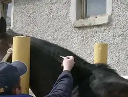 Microchips can be implanted by a veterinarian or at a shelter. After checking that the animal does not already have a chip, the vet or technician injects the chip with a syringe and records the chip's unique ID. No anesthetic is required, it is a simple procedure and causes little discomfort: the pain is minimal and short-lived.[3] In dogs and cats, chips are usually inserted below the skin at the back of the neck between the shoulder blades on the dorsal midline. According to one reference, continental European pets get the implant in the left side of the neck.[4] The chip can often be felt under the skin. Thin layers of connective tissue form around the implant and hold it in place.