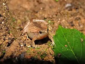Microhyla sholigari is a species of microhylid frog endemic to southern India.[3] It was described from the Biligirirangan Hills in Chamarajanagar district, Karnataka and is named after the Soliga tribal people living in the forests in and around these hills.[2] The frog was thought to be endemic to the Western Ghats and known only from the type locality and another location in Kerala and was listed as an Endangered species.[1] A recent study reported the species from 15 localities in the central Western Ghats with individuals sighted near the Bannerghatta National Park, Bangalore, Karnataka.[4] The study supplemented the original species description with color photographs, call recordings and provided a re-assessment of the threat status as per the IUCN Red List and suggest the status as Least-concern species because the criteria for classifying it as an endangered species are no longer fulfilled.[4]