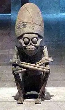 listen)) or Mictlantecuhtli (Nahuatl pronunciation: [mik.t͡ɬaːn.ˈteːkʷ.t͡ɬi], meaning "Lord of Mictlan"), in Aztec mythology, is a god of the dead and the king of Mictlan (Chicunauhmictlan), the lowest and northernmost section of the underworld. He is one of the principal gods of the Aztecs and is the most prominent of several gods and goddesses of death and the underworld. The worship of Mictlantecuhtli sometimes involved ritual cannibalism, with human flesh being consumed in and around the temple.[1]