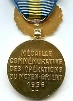 On the reverse, the relief inscription on five lines "MÉDAILLE COMMÉMORATIVE DES OPÉRATIONS DU MOYEN-ORIENT 1956" (English: "MIDDLE EAST OPERATIONS COMMEMORATIVE MEDAL 1956").[1]