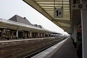 The main station layout consists of an entrance hall with ticket office, large concourse/waiting area and two covered platforms that are each subdivided into two sections i.e. platform 1 (1a and 1b) and platform 2 (2a and 2b). Two freight lines bypass to the north of the station.