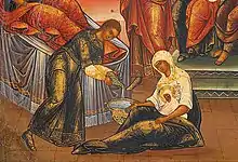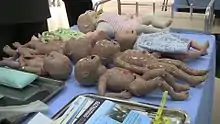 Finally, the midwife received the infant, placed it in pieces of cloth, cut the umbilical cord, and cleansed the baby.[25] The child was sprinkled with "fine and powdery salt, or natron or aphronitre" to soak up the birth residue, rinsed, and then powdered and rinsed again. Next, the midwives cleared away any and all mucus present from the nose, mouth, ears, or anus. Midwives were encouraged by Soranus to put olive oil in the baby's eyes to cleanse away any birth residue, and to place a piece of wool soaked in olive oil over the umbilical cord. After the delivery, the midwife made the initial call on whether or not an infant was healthy and fit to rear. She inspected the newborn for congenital deformities and testing its cry to hear whether or not it was robust and hearty. Ultimately, midwives made a determination about the chances for an infant's survival and likely recommended that a newborn with any severe deformities be exposed.[24]