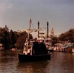 The Mike Fink Keel Boats were based on two episodes of the Davy Crockett miniseries which aired on the Disneyland TV show in 1955 -- "Davy Crockett's Keel Boat Race" (Nov 16) and "Davy Crockett and the River Pirates" (December 14).[1] The ride was named after Mike Fink, the "King of the River" who lost the keel boat race.[2] The two 38-foot boats, the Gullywhumper and the Bertha Mae, were the actual props that had been used in making the TV shows a few months earlier.[3]