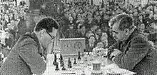 Botvinnik held the world title, with two brief interruptions, for the next fifteen years, during which he played seven world championship matches. In 1951, he drew with David Bronstein over 24 games in Moscow, +5−5=14, keeping the world title, but it was a struggle for Botvinnik, who won the second-last game and drew the last in order to tie the match.[50] In 1954, he drew with Vasily Smyslov over 24 games in Moscow, +7−7=10, again retaining the title.[51] In 1957, he lost to Smyslov by 9½–12½ in Moscow,[52] but the rules then in force allowed him a rematch without having to go through the Candidates' Tournament, and in 1958 he won the rematch in Moscow;[53] Smyslov said his health was poor during the return match.[54] In 1960, Botvinnik was convincingly beaten 8½–12½ at Moscow by Tal, now 23 years old,[55] but again exercised his right to a rematch in 1961, and won by 13–8 in Moscow.[56] Commentators agreed that Tal's play was weaker in the rematch, probably due to his health, but also that Botvinnik's play was better than in the 1960 match, largely due to thorough preparation. Botvinnik changed his style in the rematch, avoiding the tactical complications in which Tal excelled and aiming for closed positions and endgames, where Tal's technique was not outstanding.[57][58] Finally, in 1963, he lost the title to Tigran Petrosian, by 9½–12½ in Moscow.[59] FIDE had by then altered the rules, and he was not allowed a rematch. The rematch rule had been nicknamed the "Botvinnik rule" because he twice benefited from it.