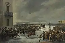 The actions of Miloradovich during the interregnum were highly controversial and provoked fringe conspiracy theories placing him at the top of the Decembrist rebel ring.[115] Mainstream historians provide different explanations of his motives, none of which supports the theory of "Decembrist Miloradovich":