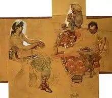 One of the brightest examples of Vrubel's academic work is his sketch "Feasting Romans". Even though it formally compiled with rules of academic art, the painting violates all the main canons of academism – the composition does not have the main focus, the plot is unclear.[28]