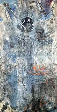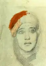 The fresco "Descent of Holy Spirit on the Apostles" that Vrubel painted on the choir of the St. Cyril's church bridged both features of Byzantine art and his own portrait pursuits. The fresco reflected most of the Vrubel's characteristic features and depicted twelve Apostles that are situated in a semicircle at the box vault of the choirs. The standing figure of Mary is located in the center of the composition. The background is coloured in blue while the golden rays are coming up to the apostles from the circle featuring the Holy Spirit.[33] The model for Mary's figure was a paramedic M. Ershova – a frequent guest in the Prakhov's house and the future wife of one of the painters participating in the restoration process. To Mary's left stands the apostle that was painted from protoiereus Petr (Lebedintsev) who at that time taught at the Richelieu lyceum. To Mary's right stands the second apostle for whom the Kiev archaeologist Viktor Goshkevich was modelling. The third from the right was the head of the Kirillovsky parish Peter Orlovsky who originally discovered the remains of old paintings and interested the Imperial Russian Archaeological Society in their reconstruction. The fourth apostle, with his hands folded in prayer, was Prakhov. Besides the "Descent", Vrubel painted "The entry into Jerusalem" and "The Angels’Lamentation".[37] The "Descent" was painted directly on the wall, without any cardboard and even any preliminary sketches – only certain details were previously specified on small sheets of paper. Remarkably, the painting depicts Apostles in a semicircle with their limbs connecting to the Holy Spirit emblem. This painting style was of Byzantine origin and was inspired by a hammered winged altarpiece from one of the Tiflis monasteries.[38]
