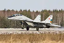 In November 2016, Russia had agreed to donate six of its MiG-29s free of charge, if Serbia would pay the repair costs of $50 million for them.[87] At the end of January 2017, Serbian defense minister Zoran Đorđević said that Belarus also agreed to donate eight of its MiG-29s to Serbia on a no-pay basis.[88] In early October 2017, Russia completed the delivery of all the six MiG-29s. The aircraft were transferred to Serbia on board the Antonov An-124 transport aircraft.[89] On 25 February 2019, Belarus formally handed four MiG-29s to the Serbian military during a ceremony held at the 558th Aircraft Repair Plant in Baranavichy. This increased the total number of MiG-29s in the Serbian Air Force to 14.[90] Serbia plans to spend about €180–230 million on modernization of its entire MiG-29 fleet.[91][92]