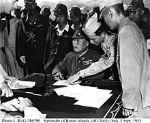 Nisei from the MIS parachuted down into Japanese POW prison camps at Hankow, Mukden, Peiping and Hainan as interpreters on mercy missions to liberate American and other Allied prisoners.[18] Arthur T. Morimitsu was the only MIS member in the detachment commanded by Major Richard Irby and 1st Lt. Jeffrey Smith to observe the surrender ceremony of 60,000 Japanese troops under Gen. Shimada.[19] Kan Tagami witnessed Japanese forces surrender to the British in Malaya.[20]
