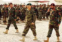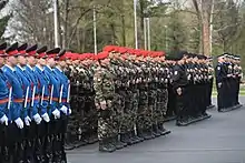 The Armed Forces continue to wear Soviet-style (pieced fabric) berets, which are draped to the right in most circumstances. When appearing in public on parade, the berets are draped to the left side so that the insignia shows to observing dignitaries and the public.