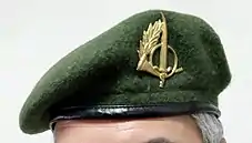 In all service branches, the beret is "bashed" to the right, and a badge or insignia is worn above the left eye. In the army, all units can wear them, with certain units wearing unique ones.[9] In the navy, the beret is an optional item,[10] and in the air force, it is only worn by certain units.[11]