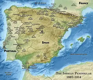 He was promoted to lieutenant-general on 25 April 1808,[27] and in June was given command of 9,000 men set to invade revolutionary Spanish America.[28] But in 1807, Napoleon had invaded Portugal, via Spain, intent on preventing its continued trade with Britain. He replaced the Spanish royal family with his own brother, Joseph Bonaparte, in May 1808.[29] In Madrid, the people attempted a rebellion against the French occupation which spread across Spain resulting in mass executions in reprisal, leading both the Portuguese and Spanish juntas (local administrations) to call on British support.[30][31]