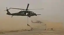 Fast-roping at a Combat Search and Rescue action, featuring a HH-60G Pave Hawk.