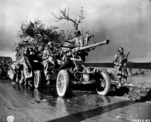 During World War II, African-American soldiers served in all fields of service. In the midst of the Battle of the Bulge in December 1944, General Eisenhower was severely short of replacement troops for existing all-white companies. Consequently, he made the decision to allow 2000 black servicemen volunteers to serve in segregated platoons under the command of white lieutenants to replenish these companies.[53] These platoons would serve with distinction and, according to an Army survey in the summer of 1945, 84% were ranked "very well" and 16% were ranked "fairly well". No black platoon received a ranking of "poor" by those white officers or white soldiers that fought with them. These platoons were often subject to racist treatment by white military units in occupied Germany and were quickly sent back to their old segregated units after the end of hostilities in Germany. Despite their protests, these brave African-American soldiers ended the war in their old non-combat service units. Though largely forgotten after the war, the temporary experiment with black combat troops proved a success - a small, but important step toward permanent integration during the Korean War.[54][55] A total of 708 African Americans were killed in combat during World War II.[56]