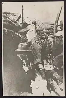 On 19 May 1915, the Turkish launched an assault against the Anzac perimeter. Forewarned by naval reconnaissance aircraft, the troops were on alert and the position was reinforced by the return of the 2nd and New Zealand Infantry Brigades from Cape Helles and the arrival of the 1st Light Horse Brigade and New Zealand Mounted Rifles Brigade from Egypt.[44] Along most of the line, the attack met with immediate disaster, with the Turkish attackers swept away by the rifle and machine gun fire of the Anzac defenders.[45] At Courtney's Post, one of the most exposed parts of the perimeter, the Turks managed to enter the trenches but there they encountered Lance Corporal Albert Jacka and others, who drove them out again. For his action, Jacka became the first Australian to win the Victoria Cross in the war.[46]