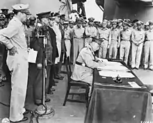 Elements of the RAN and RAAF also took part in the liberation of the Philippines. Four Australian warships and the assault transports Kanimbla, Manoora and Westralia—along with a number of smaller warships and support ships—took part in the US landing at Leyte on 20 October 1944. Australian sources state that Australia became the first Allied ship to be struck by a kamikaze when she was attacked during this operation on 21 October, though this claim was disputed by US historian Samuel Eliot Morison.[152] Australian ships also participated in the Battle of Leyte Gulf, with Shropshire and Arunta engaging Japanese ships during the Battle of Surigao Strait on 25 October. The Australian naval force took part in the Invasion of Lingayen Gulf in January 1945; during this operation, Australia was struck by a further five Kamikazes which killed 44 of her crew and forced her to withdraw for major repairs. RAN ships also escorted US supply convoys bound for the Philippines.[153] The RAAF's No. 3 Airfield Construction Squadron and No. 1 Wireless Unit also landed in the Philippines and supported US operations there, and 1TAF raided targets in the southern Philippines from bases in the NEI and New Guinea.[154]