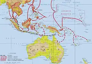 Despite Australian fears, the Japanese never intended to invade the Australian mainland. While an invasion was considered by the Japanese Imperial General Headquarters in February 1942, it was judged to be beyond the Japanese military's capabilities and no planning or other preparations were undertaken.[103] Instead, in March 1942, the Japanese military adopted a strategy of isolating Australia from the United States by capturing Port Moresby in New Guinea and the Solomon Islands, Fiji, Samoa and New Caledonia.[104] This plan was frustrated by the Japanese defeat in the Battle of the Coral Sea and was postponed indefinitely after the Battle of Midway.[105] While these battles ended the threat to Australia, the Australian government continued to warn that an invasion was possible until mid-1943.[103]