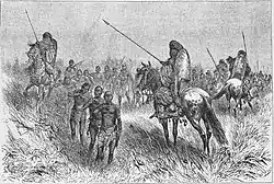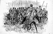 All farari, like the ton-tigui of Sundjata's generation, were accompanied by jonow who followed on foot and cared for their master's horses.[31] These jonow were known as sofas, and they would have supplied their ton-tigui with extra javelins in the middle of battle or guarded his getaway horse if retreat was necessary.[32] In fact, the word sofa translates as "horse father" meaning guardian of the horse.[33]